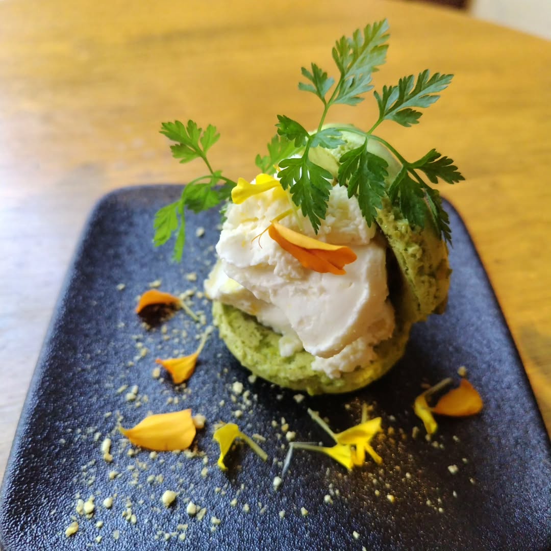 淡路島平岡農園のレモンのレモンピールとマスカルポーネ、ピスタチオのマカロンを合わせたデザートのような一品です🍋